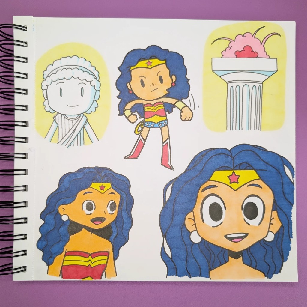 Two pages of a tidy sketchbook with drawings I did before I went all in on anime-style practice. Here I was playing around with doing both anime and cartoon styles (because ultimately I want to be good at BOTH).