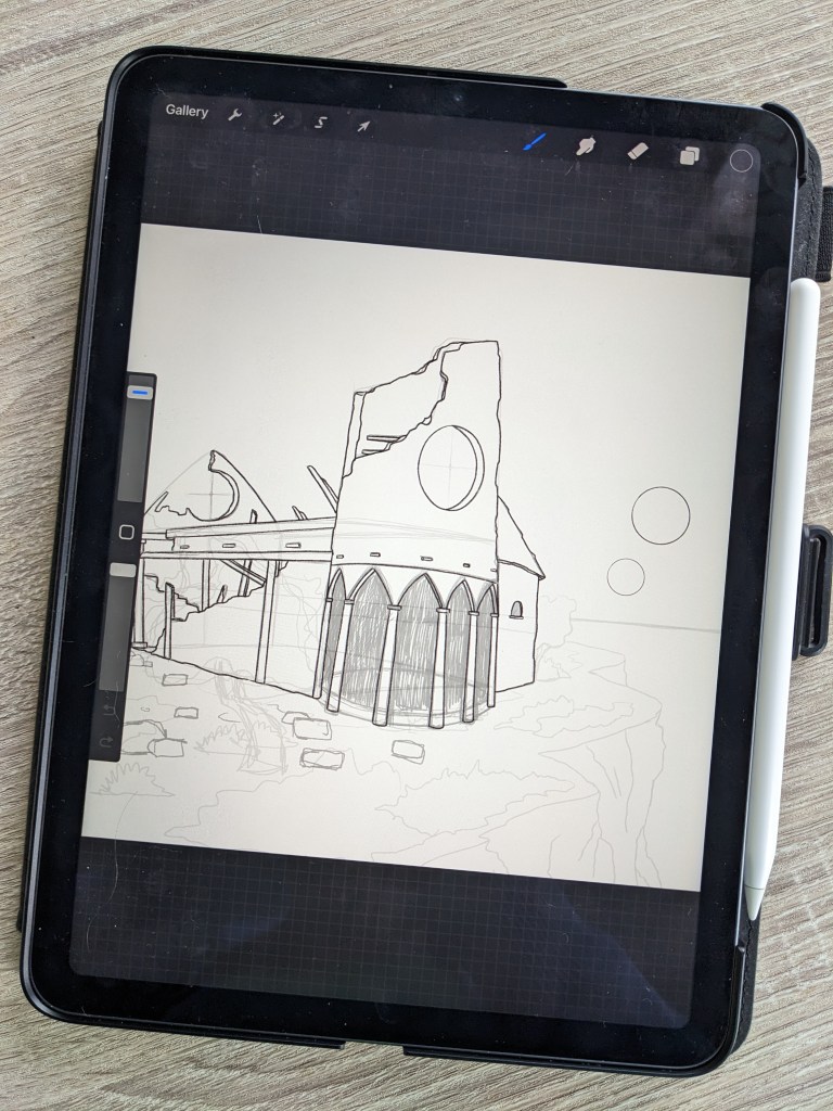 For the illustration, early in April I started a drawing of a building in Vietnam that I found while just clicking around Google Maps. I drew it in my sketchbook first, in pencil then ink. I really enjoyed working in my sketchbook on a more intricate drawing. I then uploaded it to Procreate. I ended up re-inking it, just for fun again, then colored it digitally. Then re-inked it again again with a different brush, and colored it two more times. OOF.